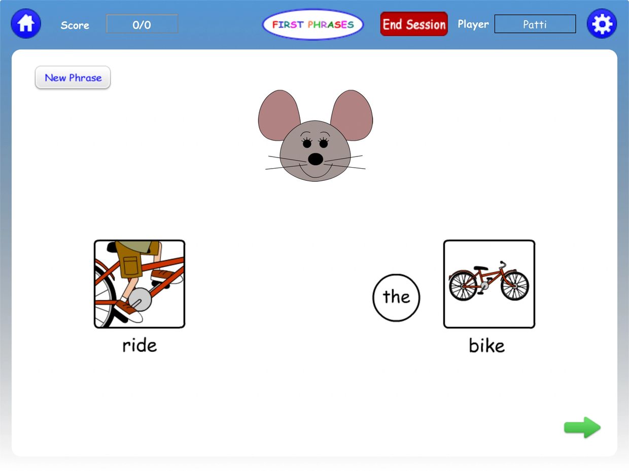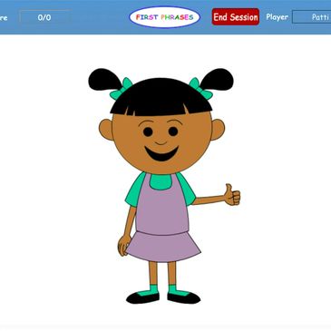 A. The child can select the character(s) to play with or the program will select them randomly. The choices are a mouse, a cat, a bear, a girl, dog or a boy. The narrator instructs the child to tell the character what to do. For example, if the girl is selected, the child is told, “Tell the girl what to do.” In the normal mode, the child then touches each part of the phrase, in order. As each word/part is touched, a pre-recorded voice says the words. The child can choose a boy or girl voice to say the words in the settings or the default (the girl voice) will be used. The child is coached by the narrator to “Do it again” until the desired number of repetitions is achieved. (In settings, can be one, two or three repetitions. The default is one tapped phrase.)